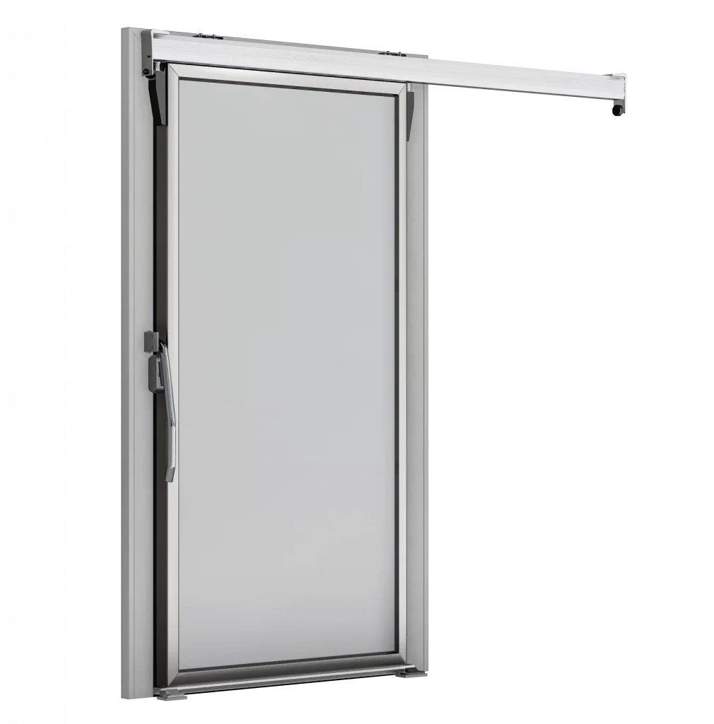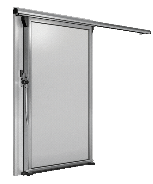 - Marco: sabemos que una de las partes más importantes de estas puertas son el marco, dado que su correcta instalación permite una mayor eficiencia y durabilidad. Este posee un perfil de aluminio extrusionado y posteriormente lacado en blanco, con doble rotura de puente térmico. Este marco tiene la posibilidad de equiparse con resistencia para evitar la congelación del burleta en las cámaras de baja temperatura. Es adaptable a cualquier panel u obra civil.